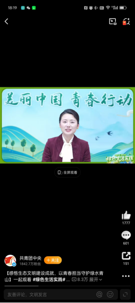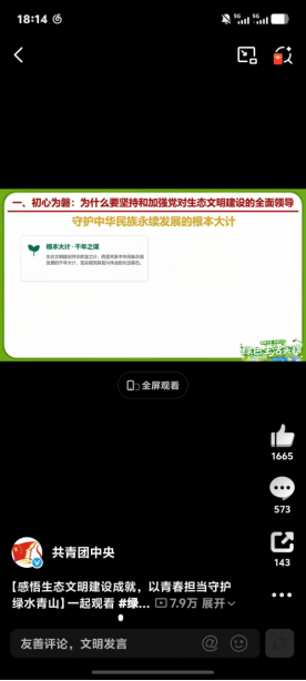 本次团课以《坚持和加强党对生态文明建设的全面领导》为主题,是“美丽中国·青春行动”2026年青少年绿色生活实践活动的重要内容。各班共青团员通过微博扫码预约,准时收看直播,认真学习团课内容,深入领会生态文明建设的核心要义。